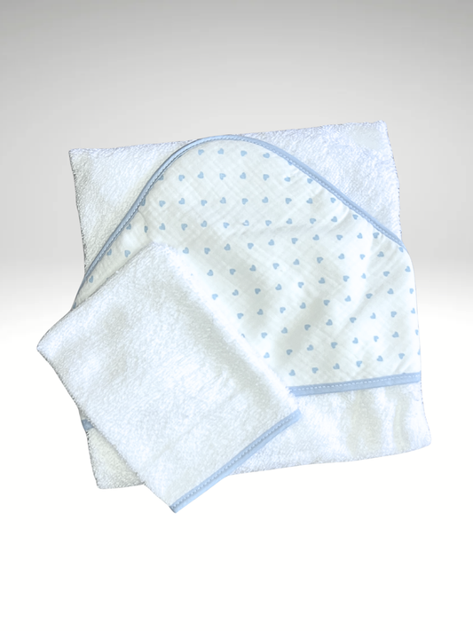 Cape de bain + gant de toillette coeurs en gaze de coton